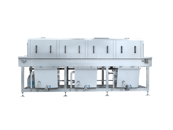 需清洗的周轉筐由不銹鋼鏈條輸入清洗機中,依次通過預洗過程→主洗過程→漂洗過程→噴淋清洗,將筐子清洗干凈;采用連續式清洗,以提高清洗效率;