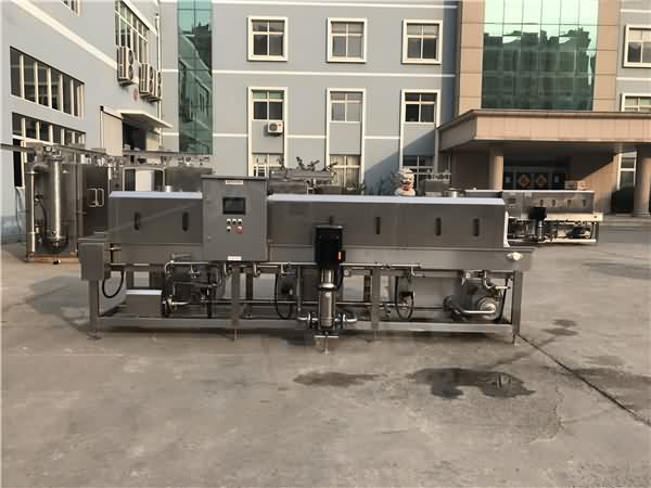 周轉(zhuǎn)箱清洗時,將周轉(zhuǎn)箱放在雞蛋托盤消毒機底導軌上,根據(jù)周轉(zhuǎn)箱的寬度調(diào)節(jié)兩側(cè)的側(cè)導軌,上導軌通過重力壓緊在周轉(zhuǎn)箱上,保證周轉(zhuǎn)箱運行平穩(wěn),啟動電機,電機帶動鏈輪轉(zhuǎn)動,鏈輪帶動周轉(zhuǎn)箱在周轉(zhuǎn)箱運行通道內(nèi)依次通過溫水區(qū)、熱水區(qū)、清水區(qū)和干燥區(qū),電加熱器將水箱內(nèi)的水加熱,并通過溫度傳感器檢測水溫,然后通過控制系統(tǒng)調(diào)節(jié)電加熱器的加熱功率,在溫水區(qū)清洗中,用38℃-45℃的熱水通過水泵輸送到立體設置的噴淋管,再通過噴淋頭對箱體進行立體式的沖刷清洗,在熱水區(qū),用75℃-82℃的熱水通過水泵輸送到立體設置的噴淋管,再通過固定的噴淋頭對箱體進行立體式的沖刷清洗,在清水區(qū),用清水噴淋沖洗箱體或鐵盤四周,噴淋后的水流入廢水收集盤,經(jīng)過周轉(zhuǎn)盤清洗機濾網(wǎng)過濾后流入收集箱循環(huán)使用。清水洗以后進入啤酒筐起襲擊干燥區(qū),風機送風,分別從周轉(zhuǎn)箱四周的汽刀孔中吹出高速空氣流對周轉(zhuǎn)箱殘留水滴吹走并風干。