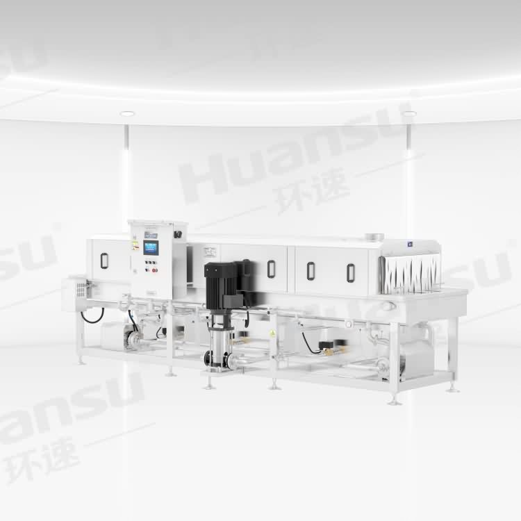在浸泡階段中,塑料箱在清水中平穩地移動,同時,得到浸泡。周轉箱清洗設備裝備有性能良好的過濾裝置,過濾裝置為滑開式濾網結構,并裝備有污物自動排放機構。水平衡裝置的結構與洗瓶機水平衡裝置的結構相似。通過管路向凈水區、水噴身區和預噴射區供水。水槽的上面是水噴射系統,這樣,溢流的水就可以進入預噴射區:通過水槽進人預噴射區的遺留水將會改善預噴射區的預清洗效果。