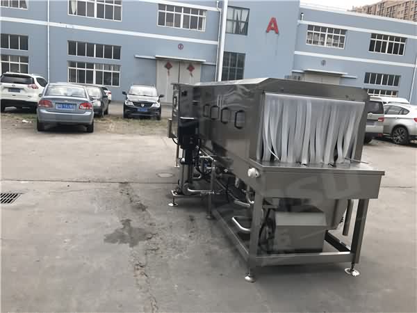 1、通過(guò)預(yù)洗、高壓水流清洗、漂洗、沖洗等連續(xù)四道清洗,將周轉(zhuǎn)筐充分清洗并消毒: