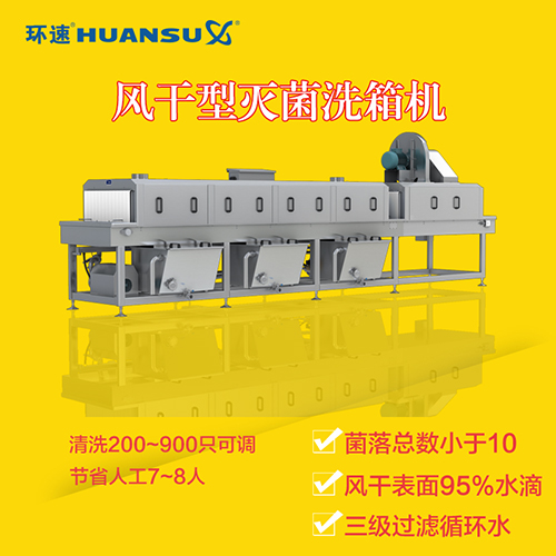 傳統的大型塑料筐是通過清洗員工手工清洗,雖然清洗效果很好,但是其用水量大,清洗效率低,勞動量大,而且不利于企業全面自動化的生產。為了提供一種高效率的清洗方式,我司自主研發了一款風干型洗筐機,該洗筐機不僅提高了塑料筐的清洗效率,而且機械結構簡單,制造成本低,推進食品加工的全面流水線生產。