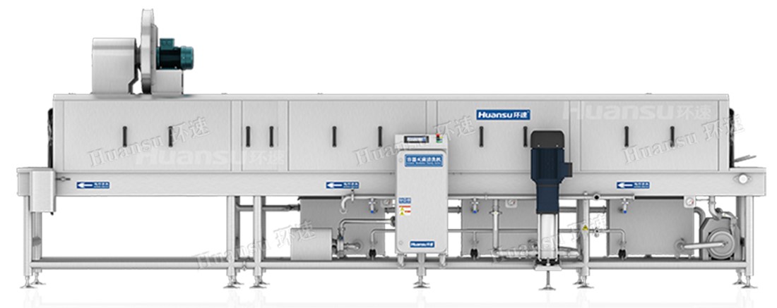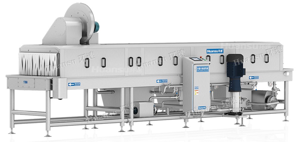 塑料筐清洗機通過使用80°C以上的高溫水對容器進行清洗,先后通過預洗、主洗、漂洗、凈洗四個階段將塑料周轉筐上的污漬全部清洗干凈,可加裝風干、烘干系統,使清洗后的塑料筐達到90%以上水分去除的效果。烘干系統可去除周轉筐風干后殘留的小水珠,并對容器再次進行高溫滅菌,以此達到容器快速周轉使用的目的。