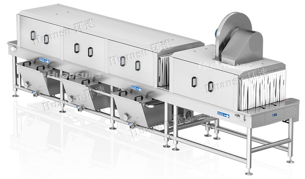為了使盛放水產品的塑料筐可以洗的干凈,環速通過使用“四步快速清洗”使容器煥然一新。將塑料筐放入清洗機中,先后通過預洗、主洗、漂洗與凈洗四個清洗階段完成油污與污漬的清洗滅菌。通過高溫高壓清洗,使用80°C以上的高溫水將油污與細菌可以全部清洗掉,高壓可以將污漬沖離開周轉筐表面完成透徹清洗。與其他塑料筐清洗機不同的是,環速研發設計的塑料筐清洗機可選配風干與烘干系統,可以只選擇風干系統或是烘干系統,也可以風干與烘干系統一起配備,完全根據需求進行配置。