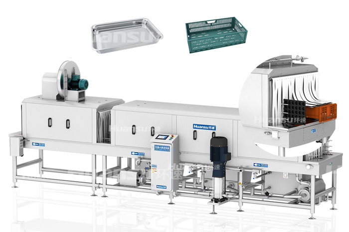 環(huán)速科技的這類設(shè)備能夠同時(shí)清洗筐類容器和盤類容器,并且在清洗時(shí)無需洗滌劑,也可以對(duì)筐盤類容器起到滅菌的效果。設(shè)備設(shè)計(jì)了筐類產(chǎn)品清洗通道和盤類產(chǎn)品清洗通道,可以同時(shí)清洗這兩類容器。