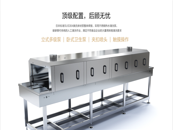 直接沖洗: 整機可直接沖洗,電控柜、電機防水或有防護罩 我們為每一個客戶量身定制較為合適的洗箱機,包括清洗、風干、烘干段,每段的布局嚴格按照所清洗的物品,合理設計流量、揚程,風干效能,在保證正常生產工作的條件下較大的節約能耗,對細菌零容忍,打造最安全的鮮食產品。