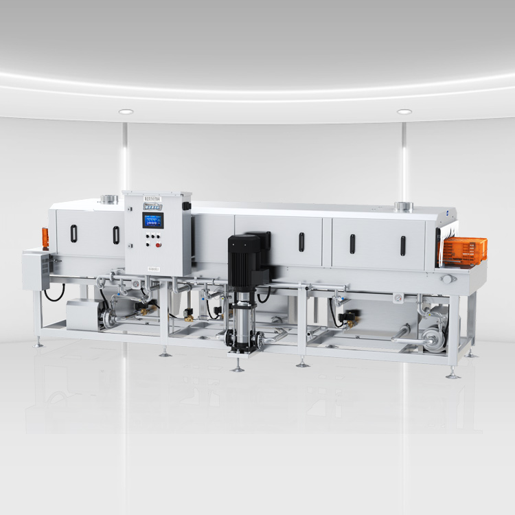 單凍器洗筐機預洗過程是水泵將水從預洗水箱中吸出,經噴嘴噴出,使食品或容器具各面收到清洗,洗掉雜物,清洗后的污水經過濾分離流回水箱,雜物排出。主清洗過程是水泵將溫水從主清洗水箱中吸出,經噴嘴噴出,使食品或容器具各面受到清洗,清洗掉剩余雜物及油污,清洗后的污水經過濾分離流回水箱,雜物排出。無菌洗箱機漂清過程是漂洗水泵將熱水從漂洗水箱中吸出,經噴嘴噴出,將被清洗物上的清洗劑等漂洗掉,同時對清洗物進行消毒,水流至主清洗水箱。洗箱機輸送系統采用變頻調速電機帶動,調節電機速度以控制清洗時間。該機側導向機構可調以,適應不同規格清洗物品。