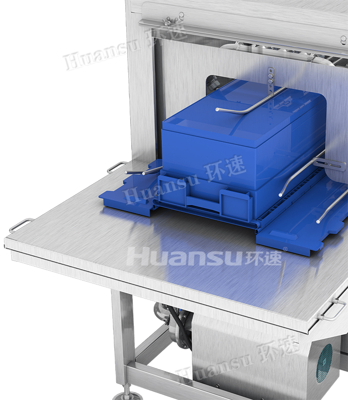 容器滅菌清洗機通過高溫(80℃以上)高壓(0.2~0.7Mpa)清洗,實現周轉箱洗凈滅菌的目的,通過高壓大流量風刀,去除周轉箱表面水分;高溫烘干系統可去除周轉箱殘留水分,對容器進行再次滅菌,實現容器快速周轉使用的目的。